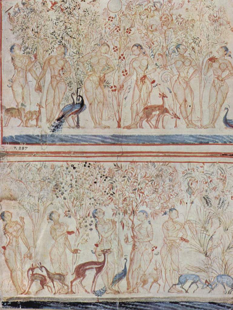 Themes and Motifs: The paintings depict scenes from the lives of the deities, with a focus on their heroic deeds and divine interventions. The compositions are filled with figures, animals, and landscapes, arranged in a narrative sequence.