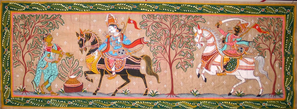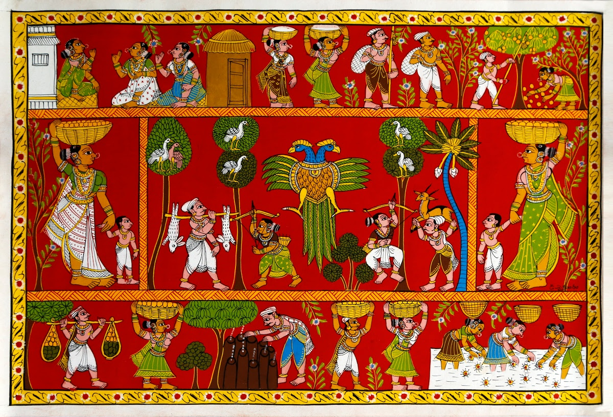 Techniques and Materials: The scrolls are made using khadi cloth, coated with a mixture of white mud, starch, and tree gum to create a smooth surface. The paintings are done using natural dyes and depict the stories in a sequential manner.