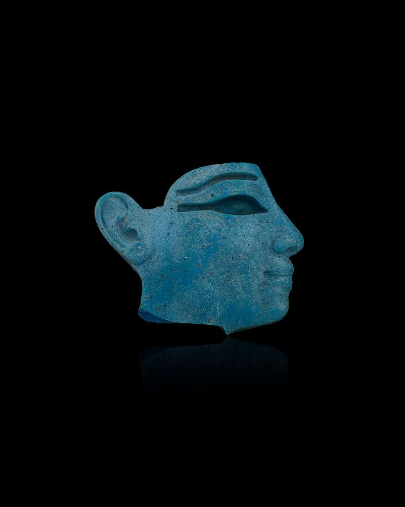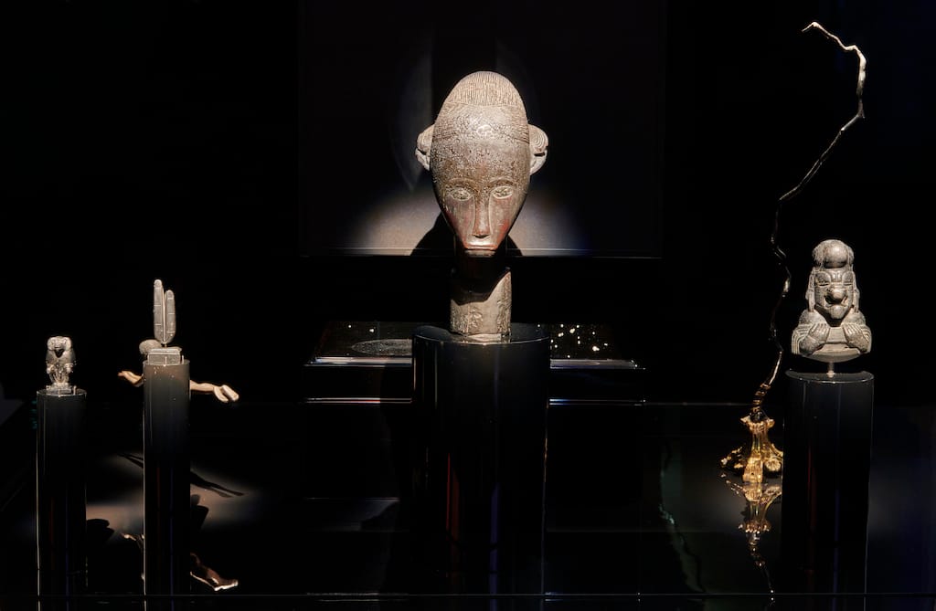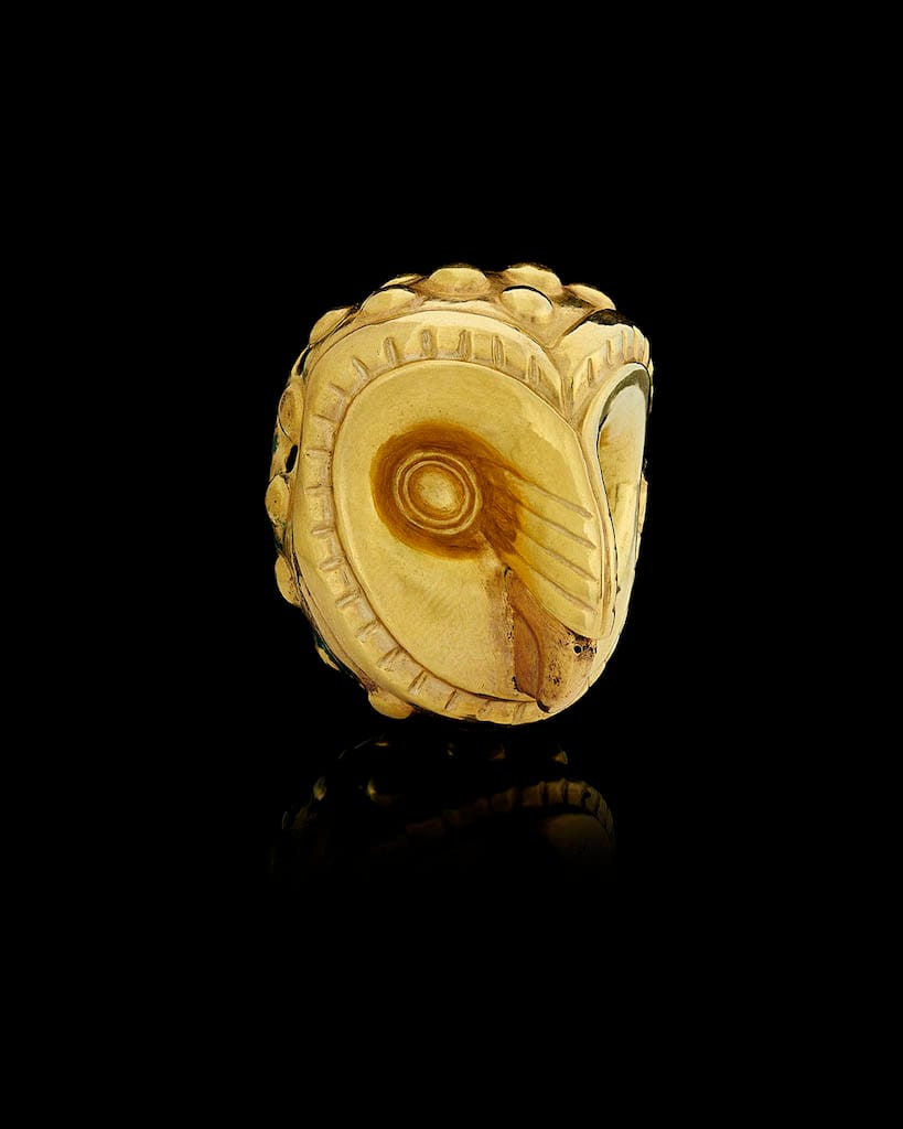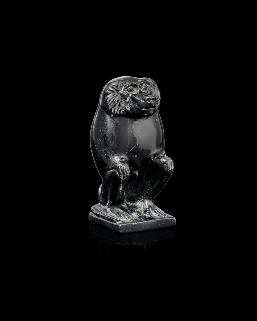 Baboon, Egypt, Late Period, 664-332 BC, Obsidian, 6 x 3 x 3 cm, The Al Thani Collection, ATC978, © The Al Thani Collection, 2018. All rights reserved. Photograph by Prudence Cuming Associates. | Owl bead, Peru, Moche, 200-600, Gold, H. 4.6 cm, The Al Thani Collection, ATC979, © The Al Thani Collection, 2018. All rights reserved. Photography by Prudence Cuming Associates Ltd. | Inlay, Egypt, New Kingdom, Ramesside, 19th-20th Dynasty, c. 1292-1070 BC, Glass, 3.8 x 4.6 cm, The Al Thani Collection, ATC1038, © The Al Thani Collection 2019. All rights reserved. Photography by Prudence Cuming Associates Ltd.