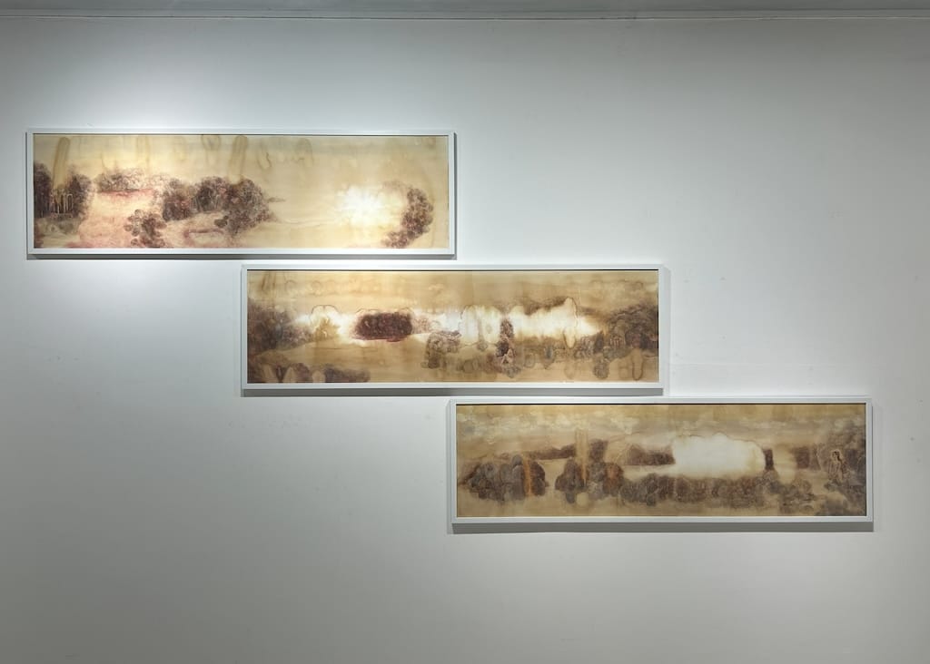 Autobiographical elements run through her work, which navigates between individual and collective experience. “From the very beginning of my artistic practice, I have journeyed through the ‘self’ to reach myself, and from there, outwards to the surroundings,” she reflects. In her Untitled work, she reimagines memories emerging from a wooden trunk—a metaphor for lineage and inheritance. In Island of Hope, masks symbolize transformation and renewal. Her Interlaced Journey captures the simultaneous act of observing others and the self, while landscapes devoid of human figures echo her belief that “I exist in the distances without a body, and that I am a part of the universe, and vice versa.”