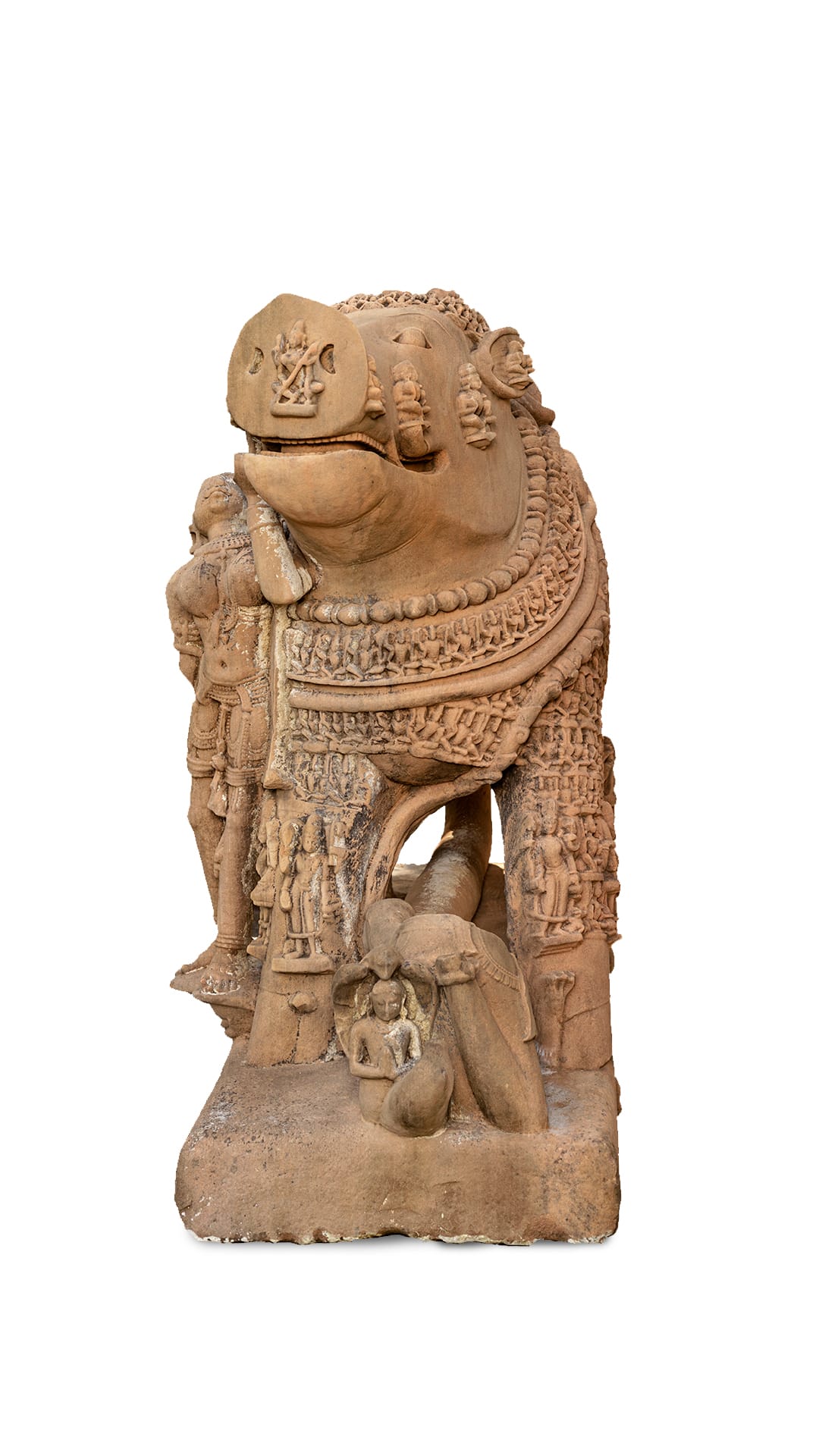 This gallery showcases five remarkable artefacts from diverse ancient cultures. The first image features the "Yajna Varaha," the Boar Incarnation of Vishnu, carved from red sandstone in Sunari, Vidisha, Madhya Pradesh, India, dating from 900–1099 CE and housed in the Vidisha District Archaeological Museum. The second image presents Hapy, the Egyptian god of the annual flooding of the Nile, crafted from sandstone during the 22nd Dynasty (924–889 BCE) in Thebes (modern Karnak) and preserved in The British Museum. The third image depicts an eagle-headed winged figure and the sacred tree, a panel from the Northwest Palace of Ashurnasirpal II, made from gypsum alabaster between 883–859 BCE in Kalhu (modern Nimrud), Iraq, and displayed at CSMVS in Mumbai. The fourth image shows Greeks fighting Amazons, a marble frieze from the Tomb of Maussollos, created around 350 BCE at the Mausoleum at Halikarnassos, Türkiye, and kept in the British Museum. The final image is another representation of Hapy, this time sculpted from marble in Lazio, Rome, Italy, during 200–299 CE, also part of the British Museum's collection.
