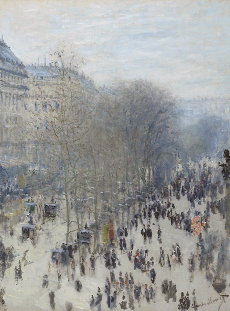 Monet’s Boulevard des Capucines depicts one of the grand boulevards of Paris. The boulevard was designed by Baron Haussmann in the mid-19th century to cut through the tightly packed medieval center of the city. The unusually high viewpoint of the painting is taken from one of the new multistory, mixed-use commercial and apartment buildings that lined these boulevards. The painting is modern in the very simple sense that its subject would not have been possible fifty years earlier.