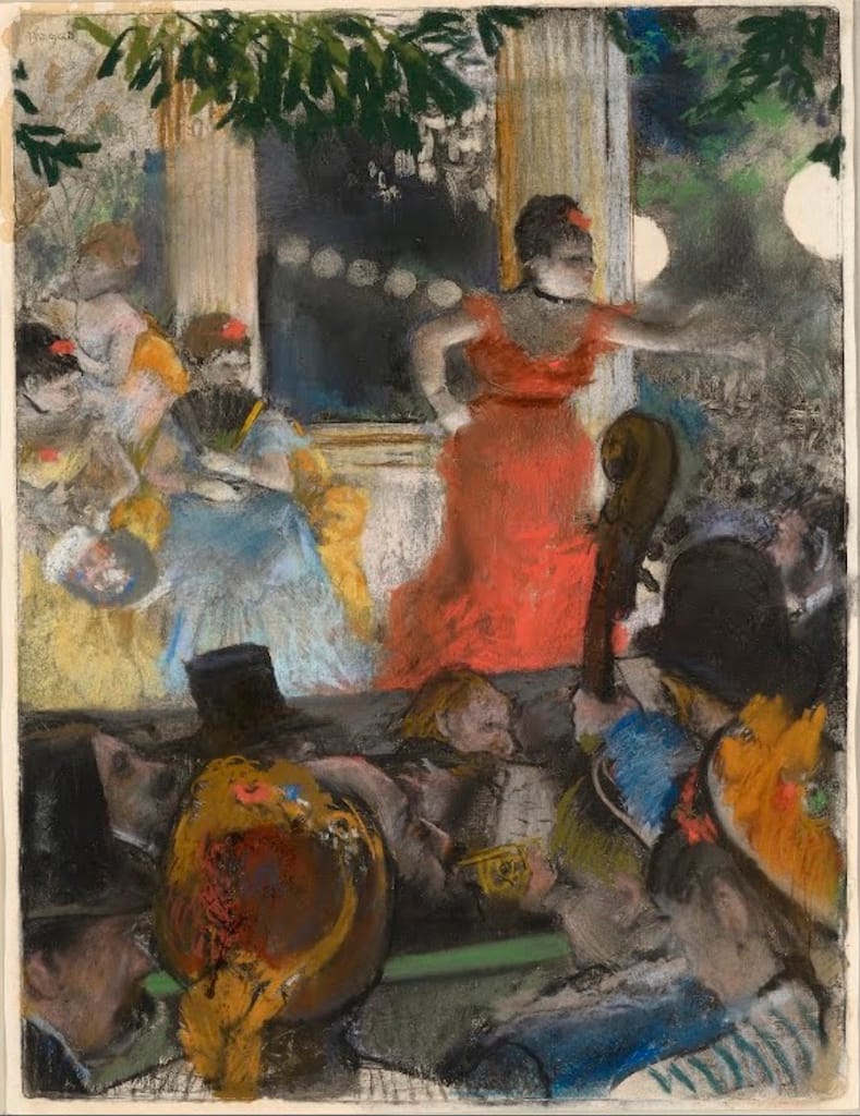 Although we can infer our viewpoint in Monet’s Boulevard des Capucines, it is unusual in that the artist gives us no clear place to stand in the work, and the orthogonal lines of the boulevard sweep off the right-hand side of the canvas, as though we were leaning perilously out a window or over a balcony railing. Similarly, Degas’s Le Café-Concert aux Ambassadeurs is remarkable for its failure to use any perspectival techniques to create space for its thicket of bodies, which emphasizes the sense of being jostled in the middle of a crowd.