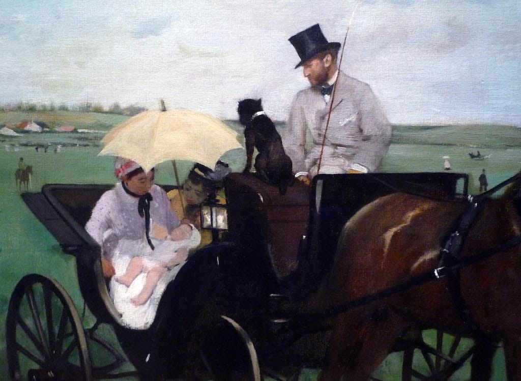 Even more unusual is Degas’s treatment of pictorial space in his painting At the Races in the Countryside, a scene set at one of the racetracks situated on the outskirts of Paris. The main focus of the work is obvious: the wet nurse and child, who are framed by the carriage door below and by a yellow parasol above, and who are the focus of attention of the child’s mother, the driver of the carriage (Paul Valpinçon, the child’s father), and their dog. This focal point is placed at the exact horizontal center of the canvas, as we might expect, but Degas appears to have achieved this placement at considerable cost to the rest of the composition. The work is egregiously unbalanced, the right hand side being crowded with heavy, dark shapes and the left hand side relatively light and empty. Furthermore, one of the horses is cropped awkwardly at the nose; the legs of both horses and the wheels of the carriage are abruptly truncated; and the carriage on the left, which is already leaning perilously to the right, has had its left supporting wheel cut off by the edge of the canvas. The work has the appearance of an amateur photographic snapshot, where subjects are frequently centered but little attention is paid to what is happening at the edges of the composition.