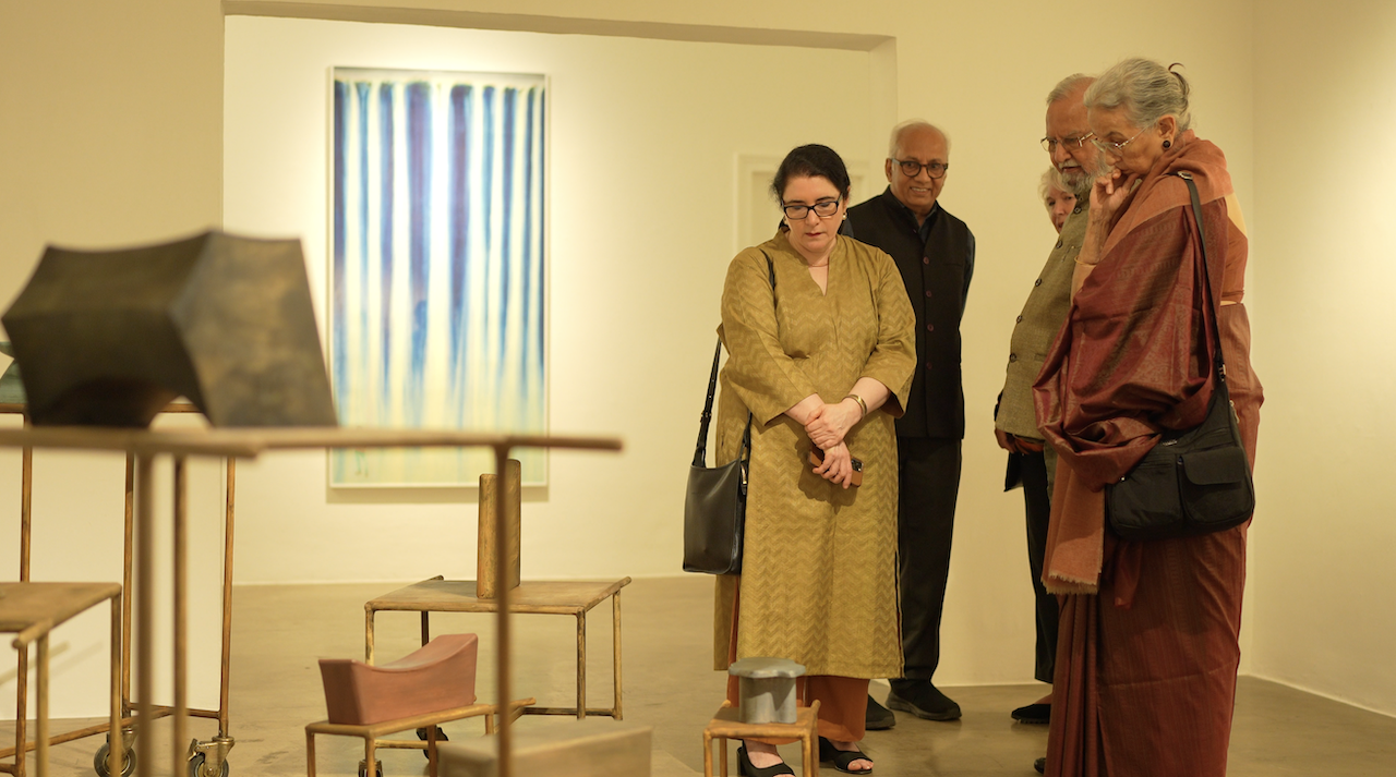 Another striking contribution comes from Biraaj Dodiya, whose octet of sculptural works draws inspiration from Patel’s dual identity as an artist and a doctor. These sculptures reference the technical tools of the hospital—gurneys, operation tables—while also evoking themes of repose, healing, and repair. “They speak to the duality of Gieve’s life and legacy,” Hoskote observes.