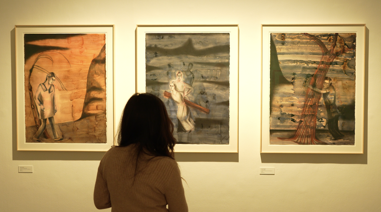 Nilima Sheikh’s quartet of paintings reimagines one of Patel’s iconic images—a battered man in a landscape. “Nilima varies the scale,” Hoskote explains, “so that we move from a close-up of the figure to a rich vista in which it is a detail.” This shift in perspective underscores the universality of Patel’s themes, situating individual vulnerability within larger contexts of social and natural environments.
