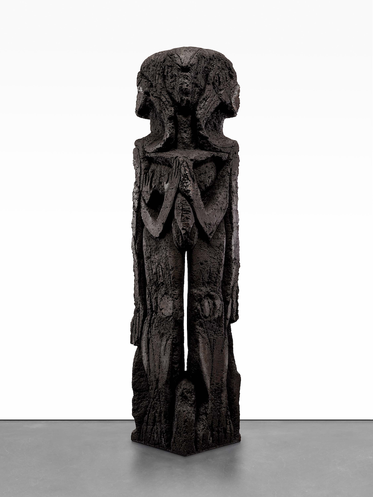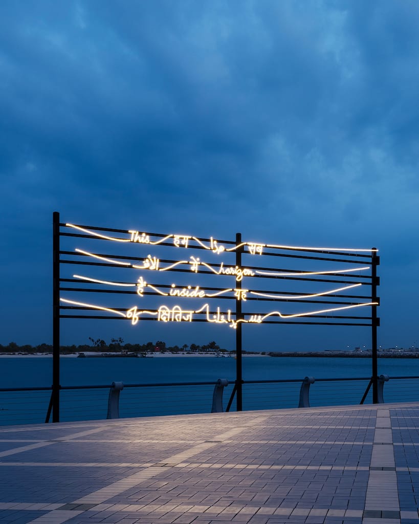 This Horizon Inside of Us by Shilpa Gupta, animated light installation, 975 x 487 cm (384 x 192 in), 2023 | Courtesy: Galleria Continua | Photographer: Lance Gerber; Unbridled Lull by Kwadwo A. Asiedu, acrylic on canvas, 161 x 120 cm, 2023, courtesy of the artist and kó; Maybe Nothing, Maybe Everything by Huma Bhabha, patinated bronze, 86.5 x 18 x 19 inches, 2024, courtesy of the artist and David Zwirner.