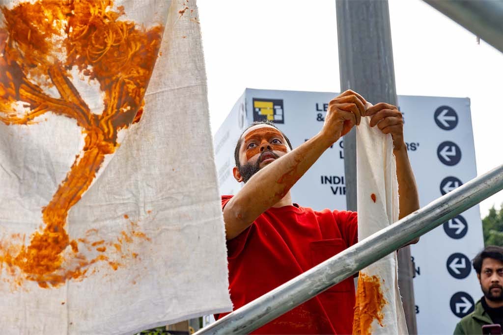 Still from performance by Jyothidas K.V. at India Art Fair; Visitors at Students' Biennale X IAF Artist-in-Residence M. Thamshangpha booth and Inclusion Lab at India Art Fair | Courtesy: India Art Fair