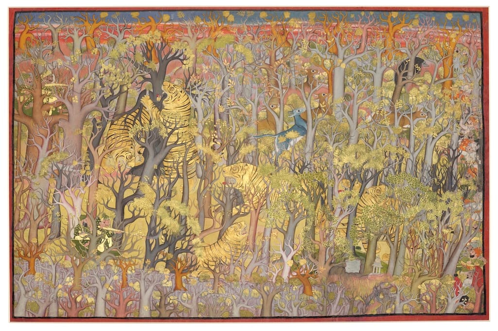 Maharao Umed Singh (r.1771–1819) and Zalim Singh Hunting Tigers, signed by Shaykh Taju, Kotah, Rajasthan, India, dated Samvat 38 / 1781 AD. Opaque pigments heightened with gold on paper, in black borders with a broad red margin, reverse plain with nine-line Devanagari inscription, signed and dated, mounted, framed and glazed. Painting 51.6 × 80 cm; folio 54.8 × 82.8 cm. This large-format and dramatically rendered tiger hunt is a tour de force of late 18th-century Kotah painting, one of only two known dated works by the master artist Shaykh Taju, and among the greatest depictions of hunting in Indian art. It captures Maharao Umed Singh and his minister Zalim Singh during a royal shikar, rendered with searing colour and intense movement that embody the Kotah school’s dynamic visual vocabulary. The composition’s layered chaos and emotional charge reflect the hunt’s unpredictability and have drawn comparisons to European panoramas and the dreamscapes of Rousseau. Recent scholarship has confirmed the inscription identifying the figures, artist, and the exact date of 20 June 1781. Exhibited in India! Art and Culture 1300–1900 at the Metropolitan Museum of Art, this monumental painting exemplifies the Kotah school’s mastery of narrative, power, and ritual, transforming royal spectacle into a work of dramatic visual poetry and one of the defining masterpieces of Rajput painting.
