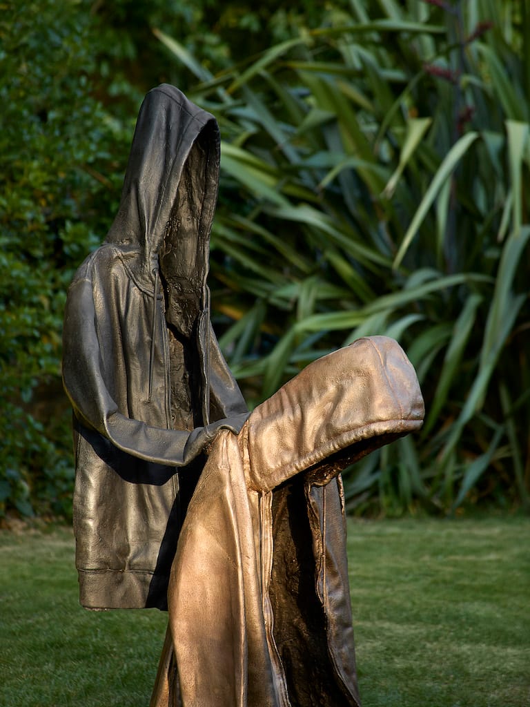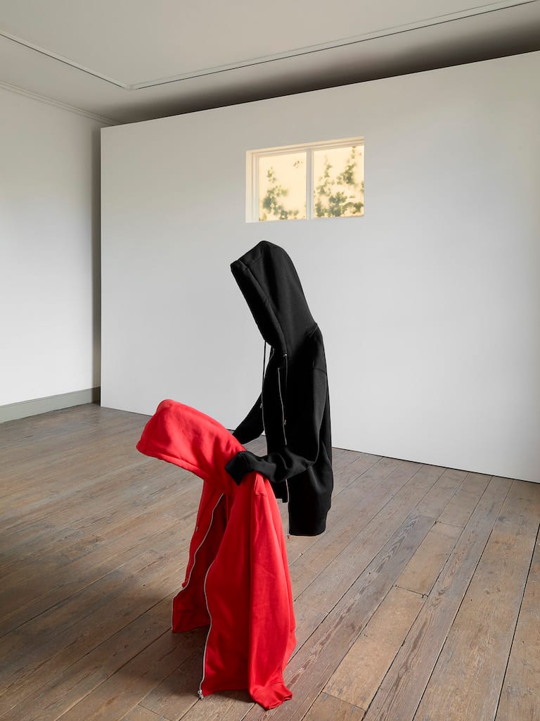 Prem Sahib’s exhibition begins in the gardens, where Bronze Apotropaic (2025)—a suspended bronze sculpture of two hooded sweatshirts—sets the tone for a show that probes visibility, mimicry, and marginality through sculptural poetics. Inside the manor, Apotropaic 1 (2023), a fabric version of the same form, continues the theme of doubling across materials and contexts.
