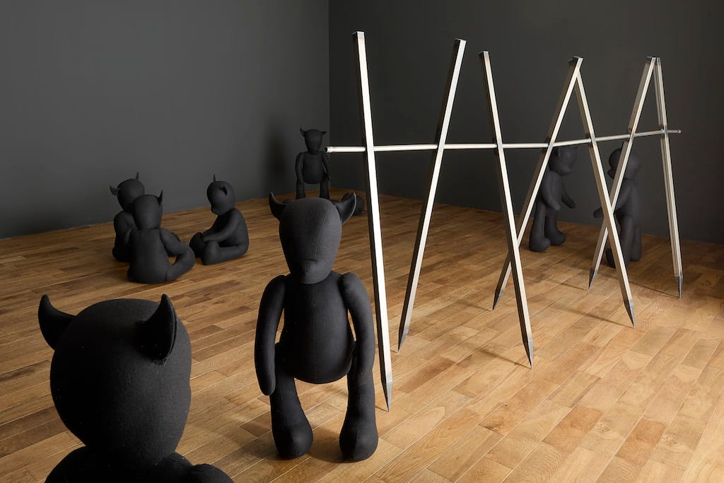 Nearby, Threshold (2025) and Ten Teddies and Barrier (2017) deepen Kaur’s explorations of protection and marginalisation. Daggers soften into symbols, tucked into fluffy forms; teddy bears are tucked away in darkness, their presence unsettling.