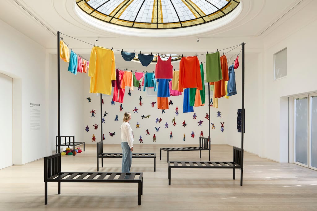 The exhibition continues in the gallery with Washing Line Bed (2024), where colourful fleece garments hang from steel bedframes beneath an ornate stained-glass window. A domestic gesture is rendered monumental and uncanny:
