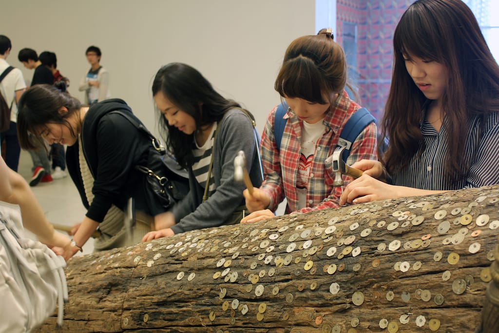 I created a therapy called Chromatophobia, which references the irrational fear of money. In this interactive piece, participants hammer coins onto a wooden log, turning the act into a calming, meditative ritual.