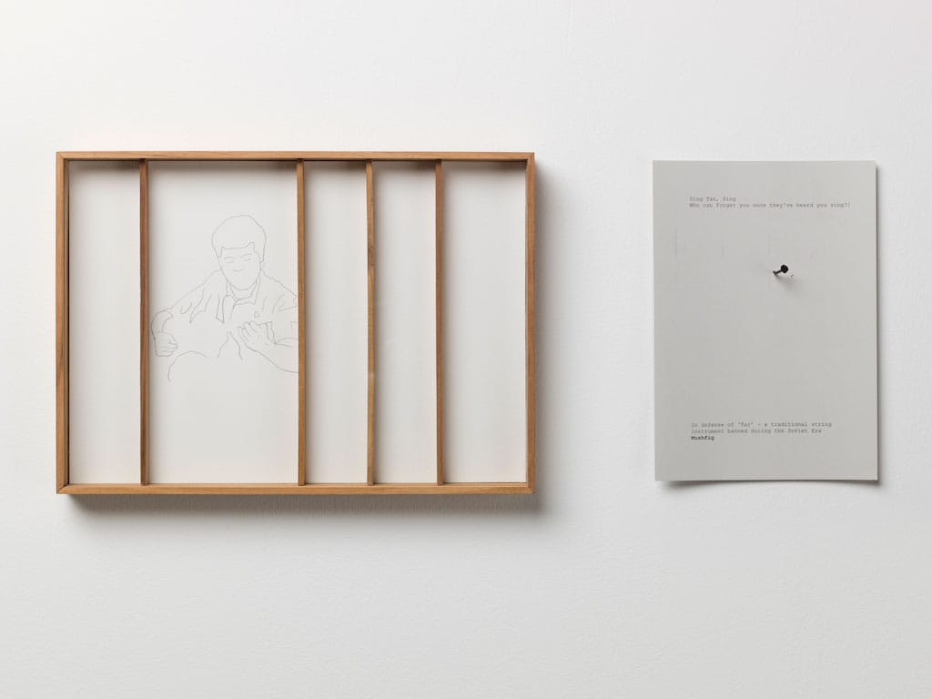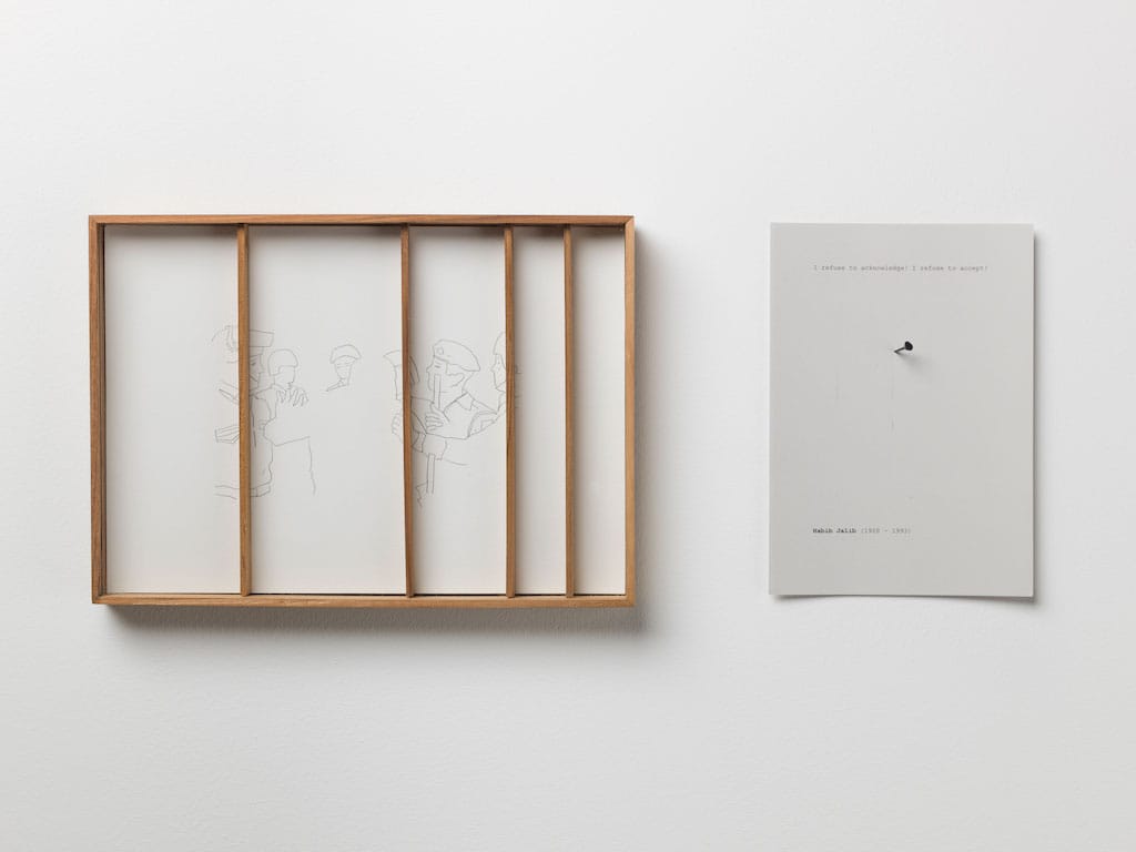 Shilpa Gupta, Untitled (Jailed Poet Drawings) (2018). Tracings on paper, wood and printed text, 31 x 22 x 3 cm each (set of ten frames). Commissioned by YARAT Contemporary Art Space. Image courtesy of the artist and Art Jameel. Photography by Pat Verbruggen. From the Art Jameel Collection.