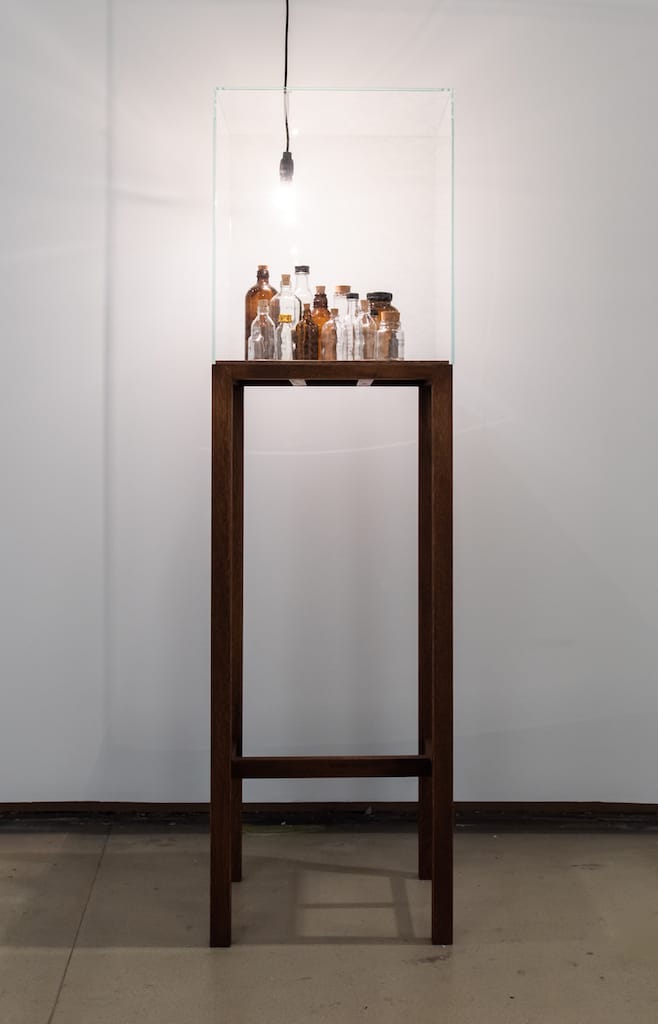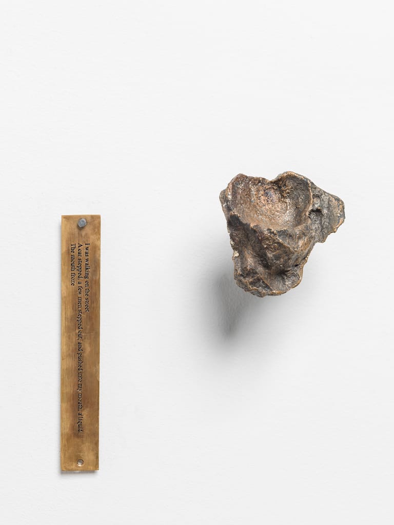 Her interest in how power operates through language is further explored in A Liquid, the Mouth Froze, a haunting metal cast of a mouth beside a cryptic brass plate, alluding to state violence against poets. “A Liquid, the Mouth Froze is about how ostentatious power can become, especially when we are not looking,” she says. Similarly, in Untitled (Spoken poem in a bottle), Gupta captures the resilience of the poetic voice. “Poems by poets who have been imprisoned have been spoken into bottles,” she explains. “While regimes imprison the body of the poet, it’s impossible to contain their words, which travel and live on.”