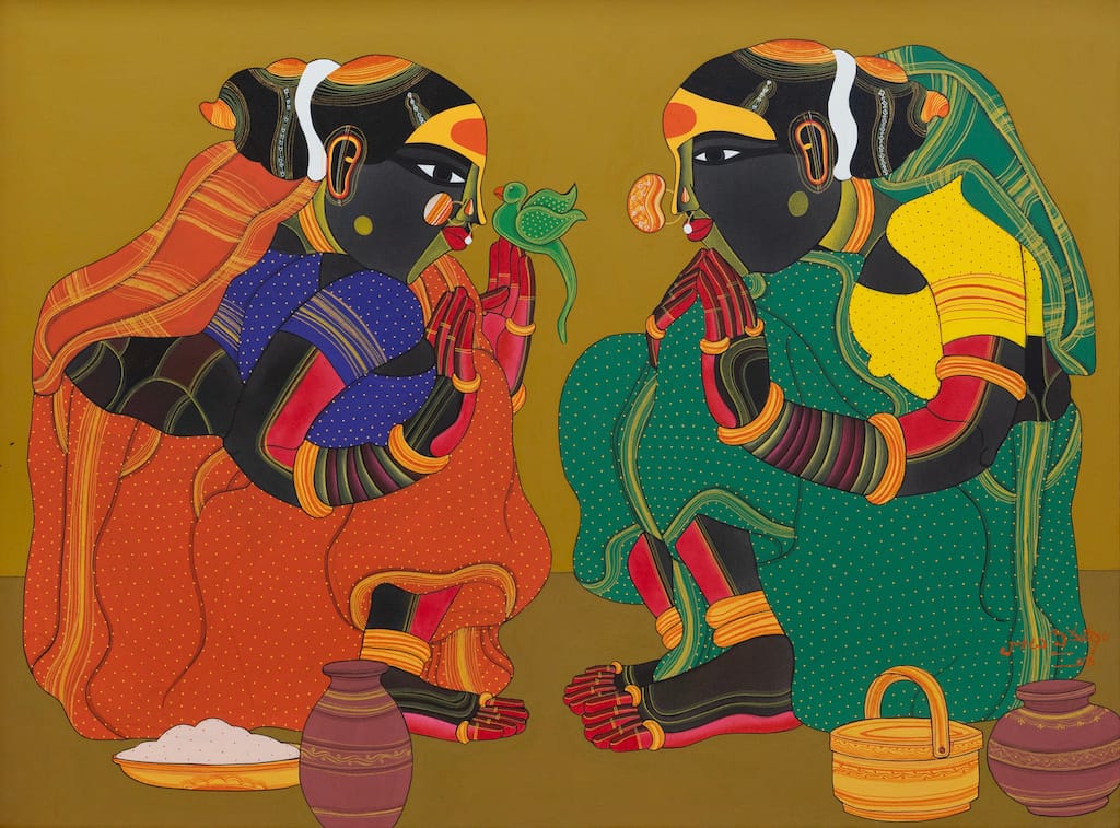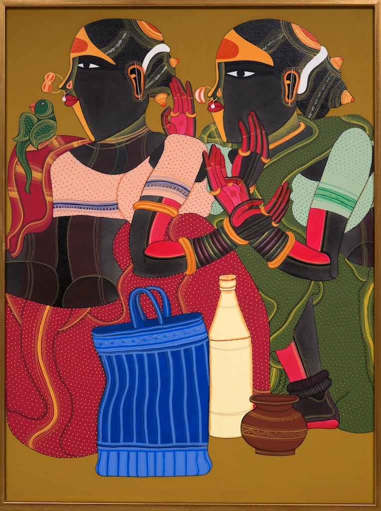 TV: The women in my paintings are a symbol of strength, power, and nurture. Their vibrant attire, intricate jewellery, and hairdos reflect their beauty, but more importantly, their inner qualities. They represent the spirit of the rural life in Telangana—resilient, grounded, and deeply connected to their cultural roots. Through their postures and expressions, I aim to capture the essence of their everyday lives, which are a celebration of the strength and resilience of women in my community.
