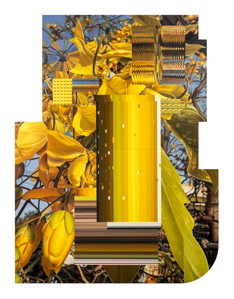ST: Your work often bridges the gap between the real and digital worlds. How does this duality manifest in your current exhibition, and what challenges did you face in translating these concepts onto unconventional canvas shapes?